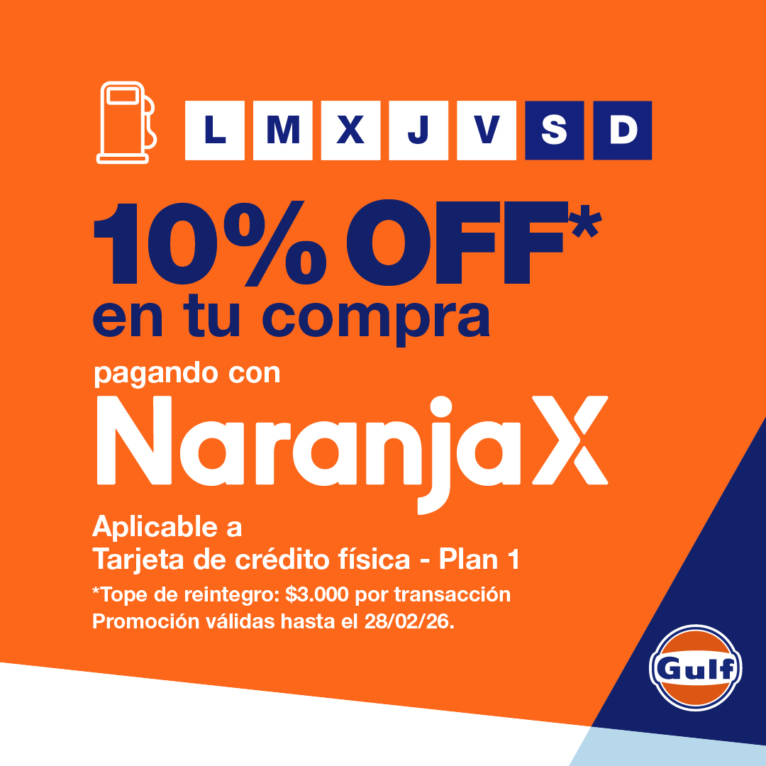 Legales : Beneficio válido para titulares y adicionales de tarjeta de crédito Naranja X de todo el país que compren combustible con NaranjaX en estaciones de servicio Gulf , adheridas de todo el país. Costo Financiero Total (CFT): 0%, Tasa Efectiva Anual (TEA): 0%, Tasa Nominal Anual (TNA): 0%. Beneficio de 10% de descuento exclusivo para compras realizadas los sábados y domingos con Nx crédito, del 01/01/2026 al 28/02/2026. Tope de reintegro $3000 por operación. No acumulable con otras promociones. Beneficio no válido para compras realizadas con Naranja Visa, Naranja MasterCard, Naranja Amex, Todo pago, Mercado Pago, Naranja Prepaga y Npos. En caso de fuerza mayor y/o caso fortuito que genere alguna imposibilidad para llevar a cabo el beneficio o para continuar con el mismo, Naranja X podrá suspender definitivamente o transitoriamente el beneficio, como así también introducir las modificaciones pertinentes. Tarjeta Naranja SA, CUIT 30685376349, La Tablada 451, Córdoba.